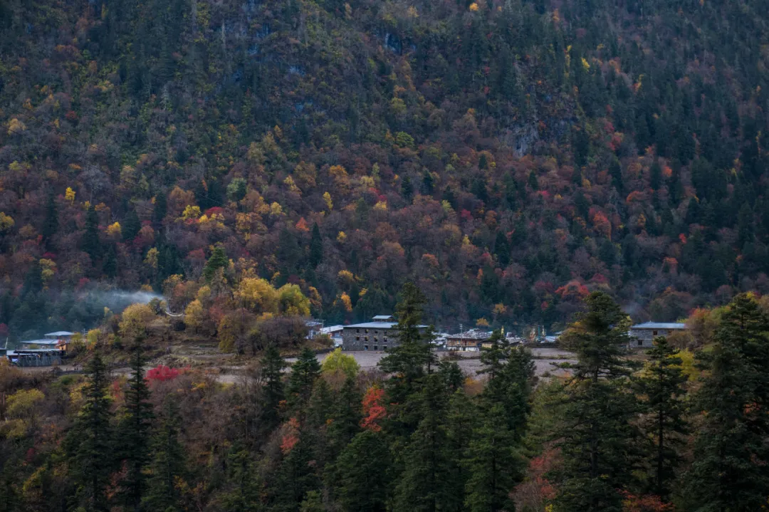 群山围绕的村寨色彩丰富旖旎的光影让泛黄的树叶变得不再萧瑟多了几分温暖的舒适感