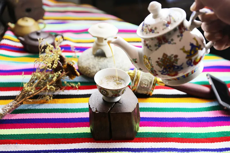 酥油茶是藏族人民日常生活不可缺少的必需品。制作时简单方便:先用土茶倒入茶筒,加入酥油、盐和精制香料,用搅棒上下反复搅打成水乳交融状,即可斟用。饮之,色香味美,回味无穷。