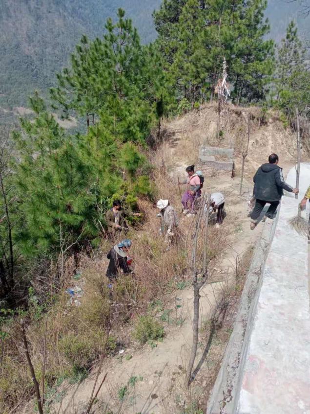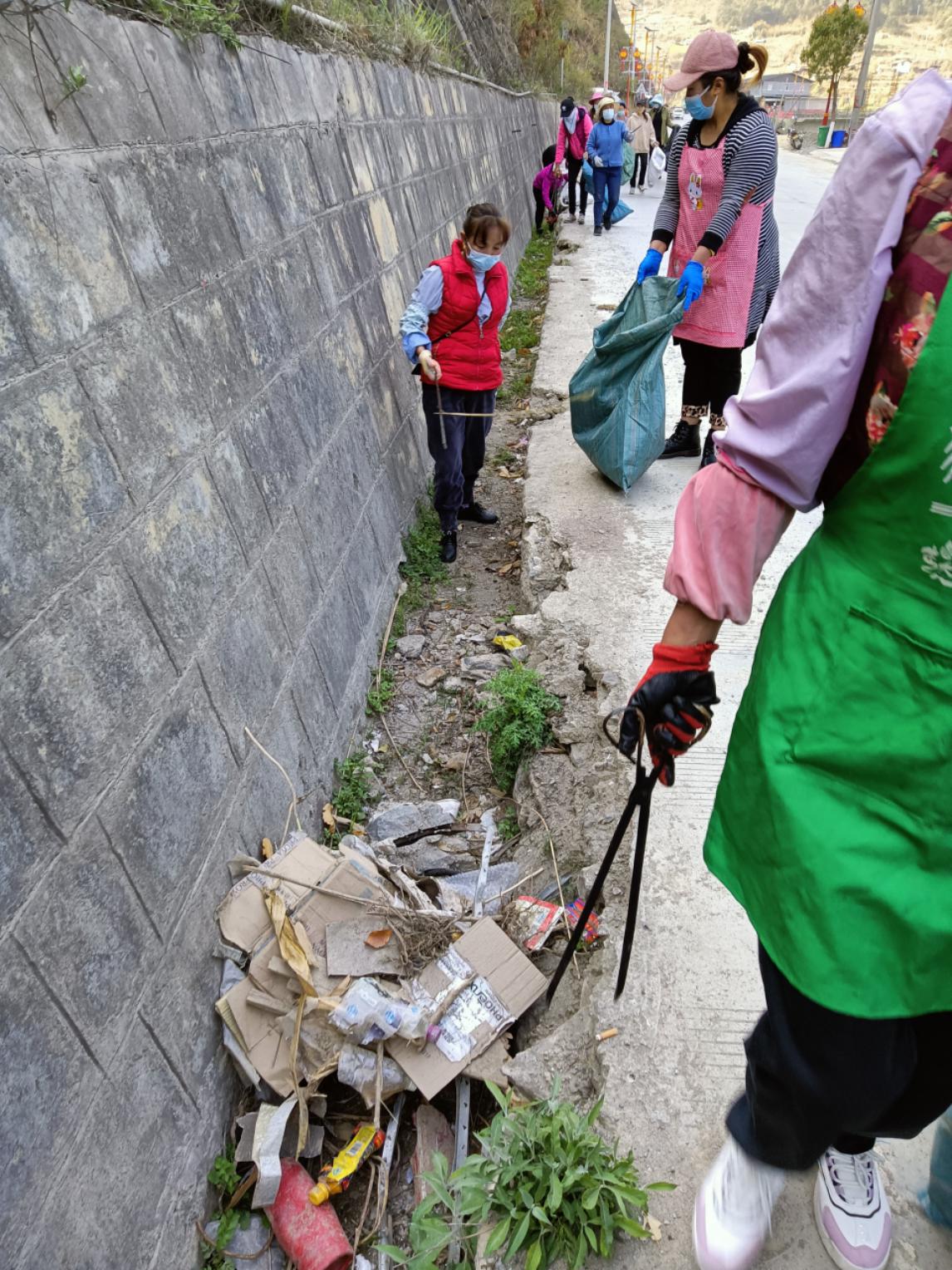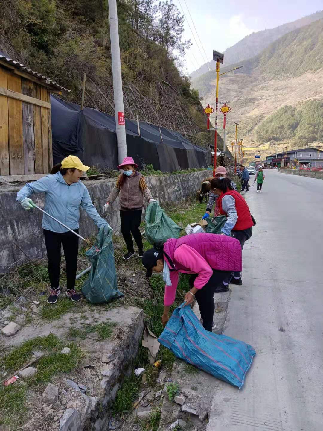弄独组组织村民从移民桥开始沿二级路一直到勺挖洛桥进行垃圾清理。