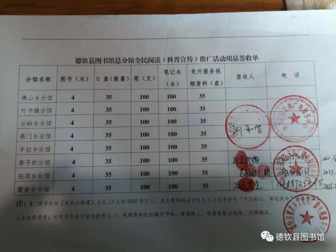 同时,根据“中国共产党成立100周年庆祝”系列活动要求,德钦县图书馆结合自身职能职责,发放了德钦县图书馆总分馆全民阅读(科普宣传)推广活动用品,包含图书资料《党史必修课》、《从13人到9000多万人:史上最牛创业团队》、《习近平关于“不忘初心、牢记使命”论述摘编》、《永远跟党走:大党百年系列宣传挂图》,视频资料、U盘、笔和笔记本等用品,总价值 1.6万元。要求各分管“4.23读书日”围绕“党史学习教育”开展活动,在全社会喧起一股读书热潮,实现全民阅读。
