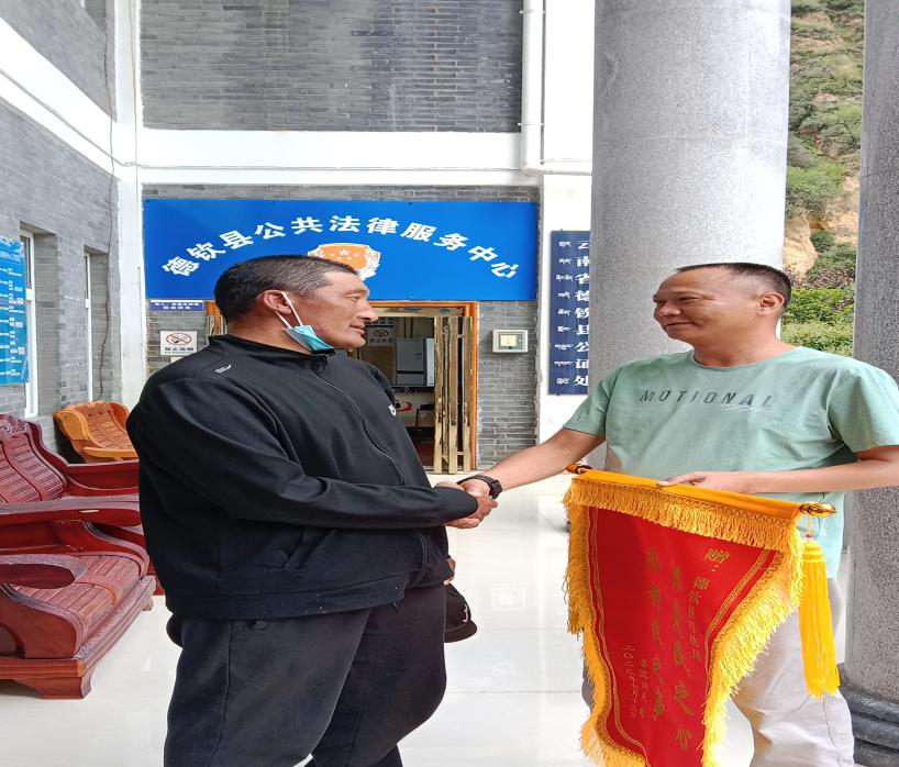 2022年8月1日,法律援助受援人鲁茸某某手持一面印有“怀爱民之心,办利民之事”的锦旗送到德钦县司法局党组书记、局长叶文彬手中,以表谢意。