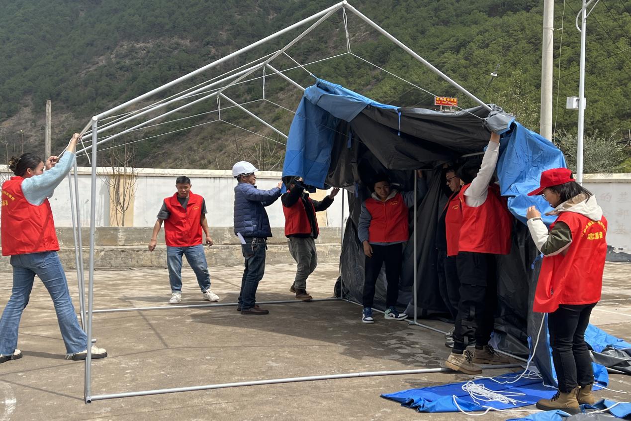 按照镇抗震救灾的部署要求,指挥部得知地震信息时,便迅速启动地震应急预案,镇党委书记、镇抗震救灾指挥部指挥长李卫华带领应急小组人员赶到震中新洛村瓦口组,立即模拟真实情况,由指挥部通讯员第一时间通知道路保通组、抢险救灾组、转移安置组、医疗救护防疫组、电力保供组、住房安全核查组、安保维稳组、宣传报道组8个救援工作组。第一时间组织人员迅速撤离至空旷地带。抗震救灾前线指挥部,紧急指挥开展交通管制及道路疏通、前线应急指挥、被困人员搜救、工程应急抢险、安置受灾人员和救灾物资发放、医疗救护、震后疾病预防控制等抗震救灾各项工作开展应急演练。