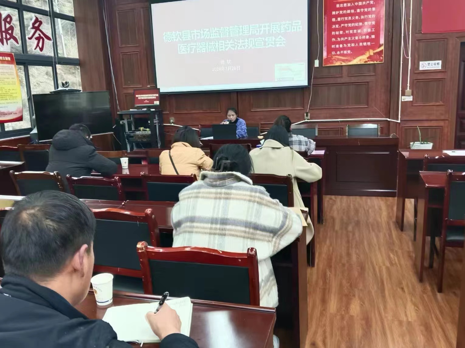 为宣传贯彻新修订的《药品经营和使用质量监督管理办法》《医疗器械经营质量管理规范》,提高监管人员业务能力,提升全县药品经营使用单位药械质量管理水平,保障公众用药用械安全。2024年3月28日,德钦县市场监督管理局利用线上线下视频会议的形式,设县局为主会场,各乡镇监管所为分会场,组织全县药品监管人员、医疗机构及药品经营企业负责人进行相关法规宣贯培训,共计26人参训。