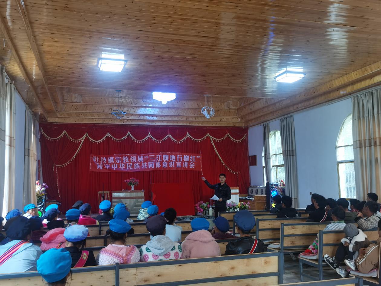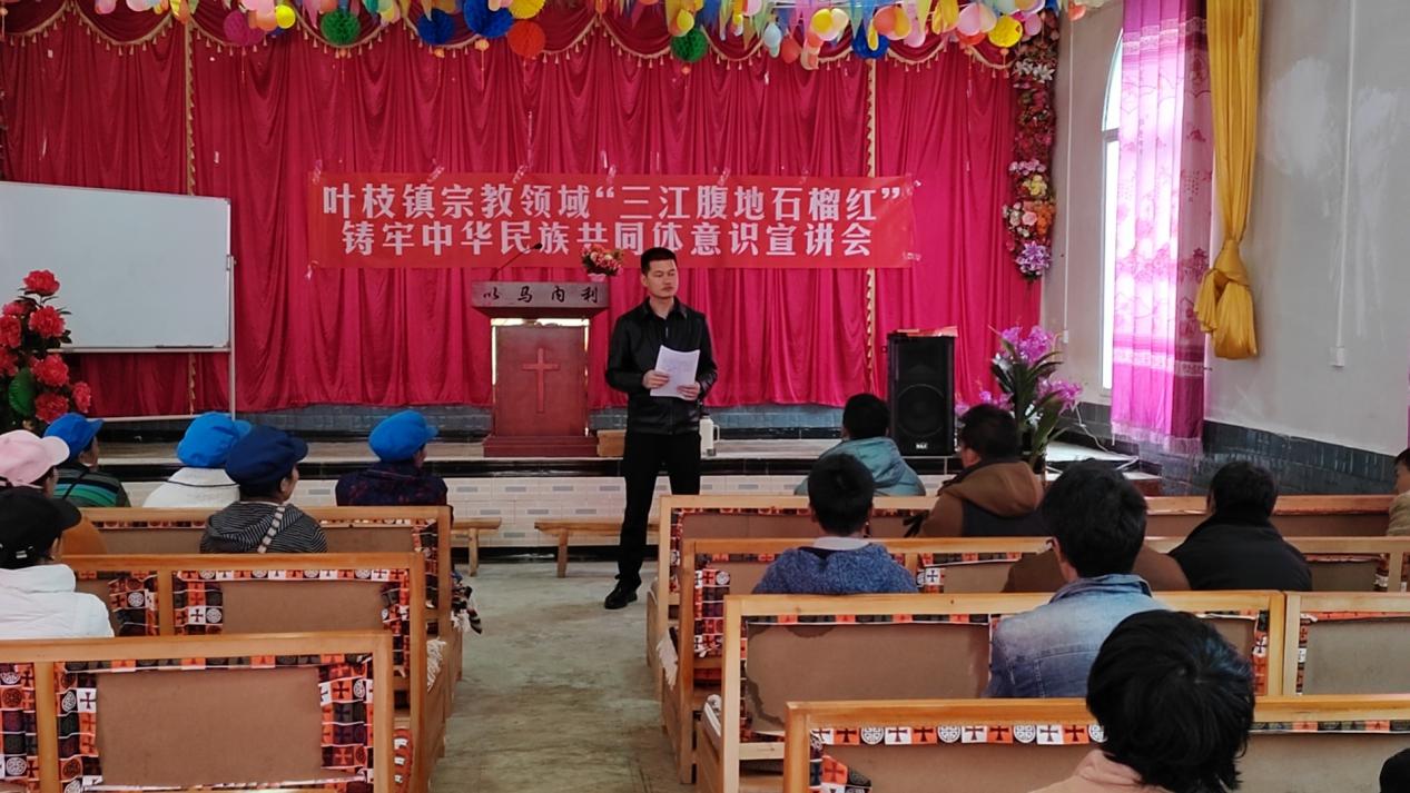 中华民族共同体意识是国家统一之基、民族团结之本、精神力量之魂。为深入贯彻习近平总书记关于加强和改进民族工作的重要思想,把铸牢中华民族共同体意识作为党的民族工作和民族地区各项工作的主线,不断加强和改进党的民族工作,扎实推进民族团结进步事业,推进新时代党的民族工作高质量发展。近日,叶枝镇党委副书记王亚强同志到辖区内各教堂点召开“三江腹地石榴红”铸牢中华民族共同体意识宣讲会,覆盖信教群众160余人次。
