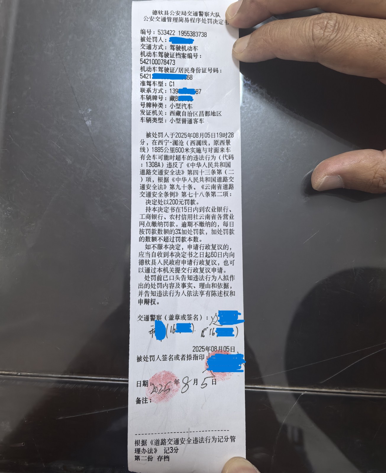 8月5日德钦县公安局迎来群众首件举报件:2025年8月5日17时34分,卓XX宗驾驶藏BXXX58小型汽车行驶至国道214线西澜线K1885+600米处实线超车,严重违反了道路交通安全法相关规定,给广大交通安全参与者的人身安全和财产安全带来严重危害。接到举报,佛山警务站、派出所立即组织警力开展核查,并8月5日19时28分向卓XX宗开出首张《公安交通管理简易程序处罚决定书》,当事人卓XX宗对其违法行为供认不讳,并真诚接受批评教育。同时,于19时51分向举报人兑现了《通告》列举的奖励金额。
