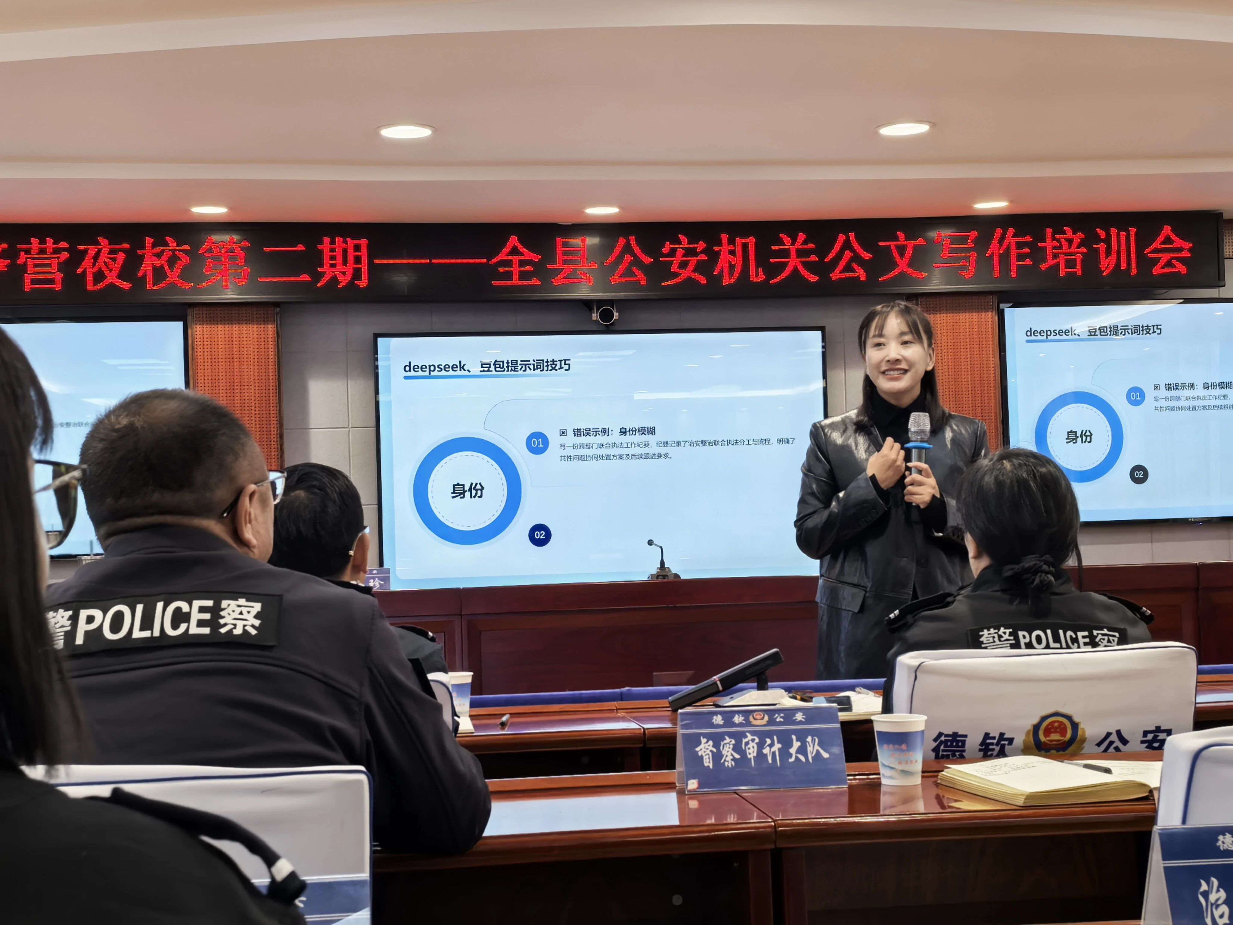 此次培训紧扣公安工作实际需求,特邀北京理工大学软件工程学院硕士、高级讲师唐玉珍,聚焦DeepSeek与豆包两款主流智能语言工具的实战应用,打造“理论讲解+案例剖析+实操演示+互动答疑”的沉浸式培训模式。授课过程中,讲师精准对接公安公文写作高频场景,围绕通知、报告、总结、请示等常用文种,从“精准提示词设计”“公文框架快速生成”“核心要点智能提炼”等模块展开详细讲解。针对基层民辅警在写作中常遇到的逻辑混乱、格式不统一、表述不规范、效率偏低等问题,讲师结合公安工作典型案例,现场演示如何运用智能工具快速搭建公文框架、补充核心内容、修正格式错误,手把手指导参训人员掌握“AI辅助构思+人工打磨完善”的高效写作方法,让智能工具真正成为提升公文质量的“好帮手”。