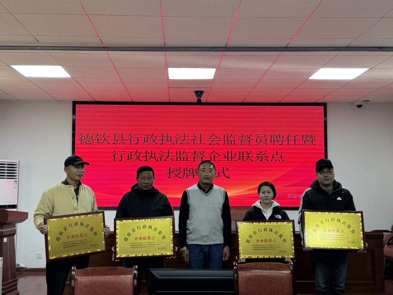 为进一步健全多层次、立体化行政执法监督体系,拓宽社会监督渠道,精准回应企业诉求,持续优化法治化营商环境,2025年12月1日,德钦县政执法社会监督员聘任暨行政执法监督企业联系点授牌仪式在司法局举行。县司法局主要负责同志,单位分管领导,新聘任的5名行政执法社会监督员及5家行政执法监督企业联系点代表参加仪式。