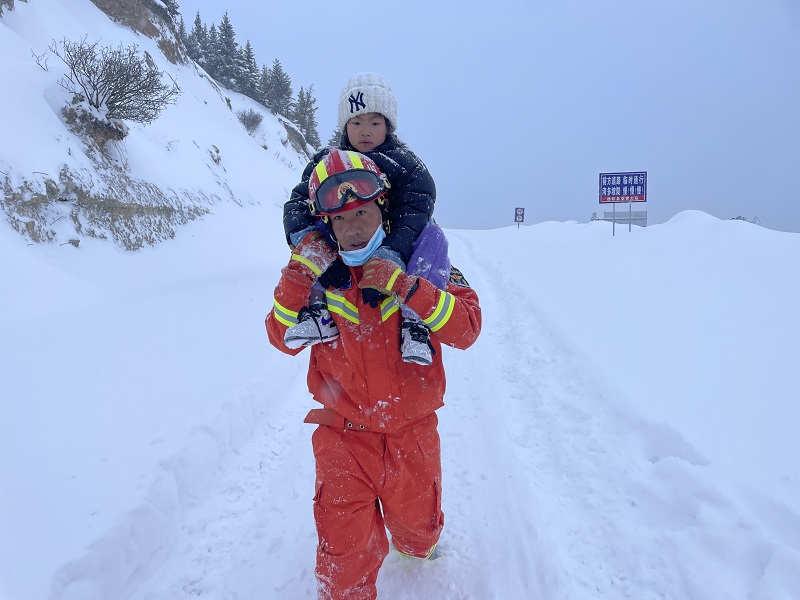 大队救援人员于18时05分到达现场并迅速展开救援行动。救援现场大雪纷飞、寒风刺骨,气温低下,路面积雪较厚,恶劣的天气环境给大队救援人员增添了救援难度,被困人员中有四名小孩,因气候恶劣,四名小孩无法自行下山,救援人员果断采取背的方式将四名小孩转移到安全地点,再折回现场对被困车辆进行救助,救援人员返回现场后,对周围环境进行观察,被困车辆因积雪过深,道路冰滑无法行动,大队长与支队指挥中心汇报情况后制定了救援方案,经过近2小时的持续奋战,救援人员充分发挥不怕苦不怕累的精神,在身心疲惫、饥寒交迫的情况下,用双手开辟出一条救援通道,20时10分成功将被困车辆及人员引导至安全路段。