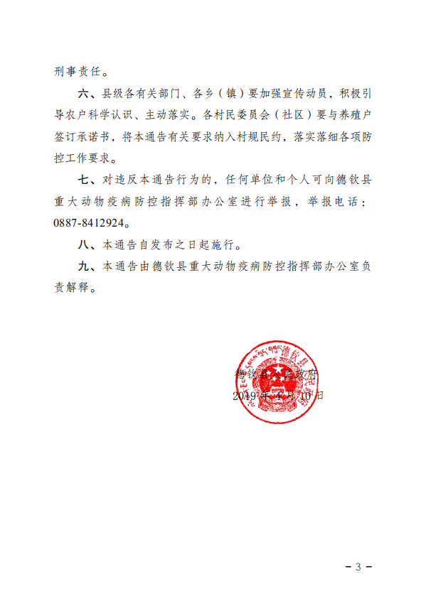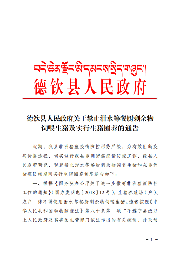 德钦县人民政府关于禁止泔水等餐厨剩余物饲喂生猪及实行生猪圈养的通告