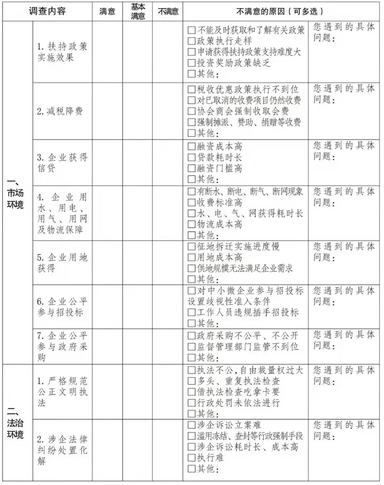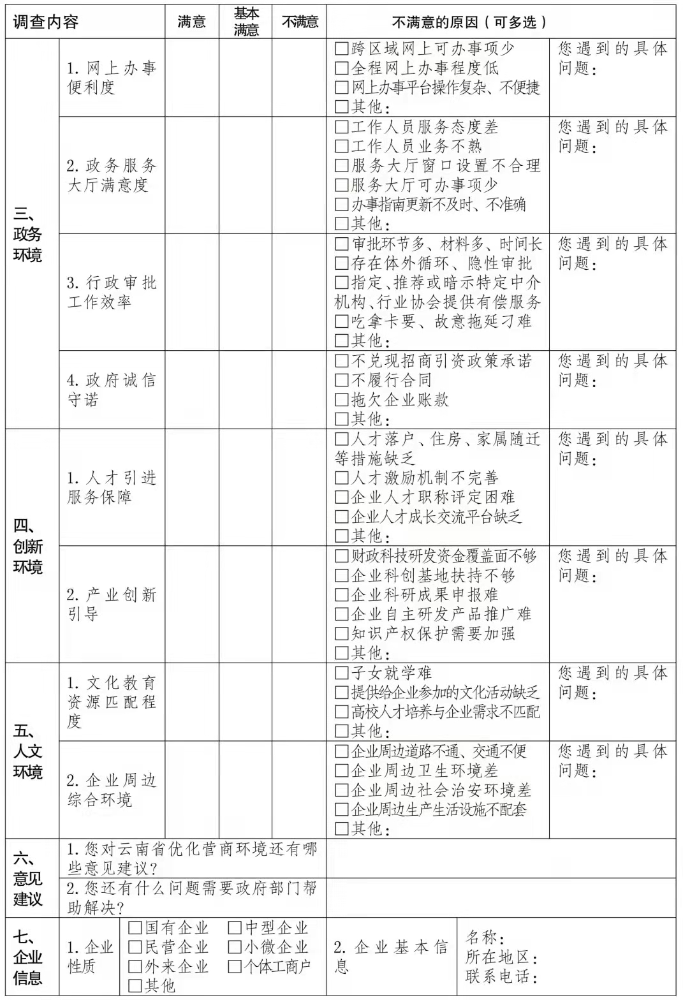 2022年云南省营商环境市场主体满意度调查问卷