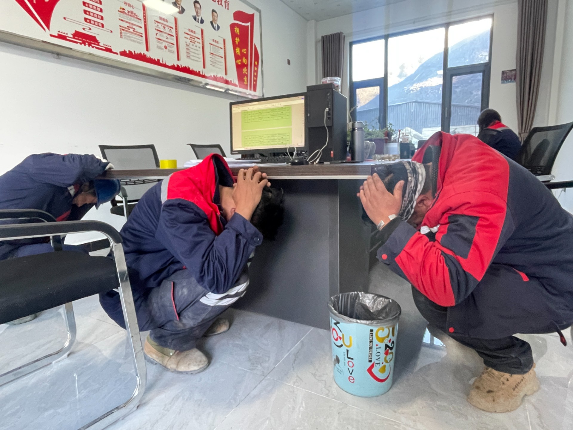 (1)应急避震:地震鸣笛信号响起后,疏散演练指导员立即指挥员工迅速抱头、闭眼,躲在桌子下,尽量蜷曲身体,降低身体重心,保护好头部,听口令进入紧急疏散演练环节。