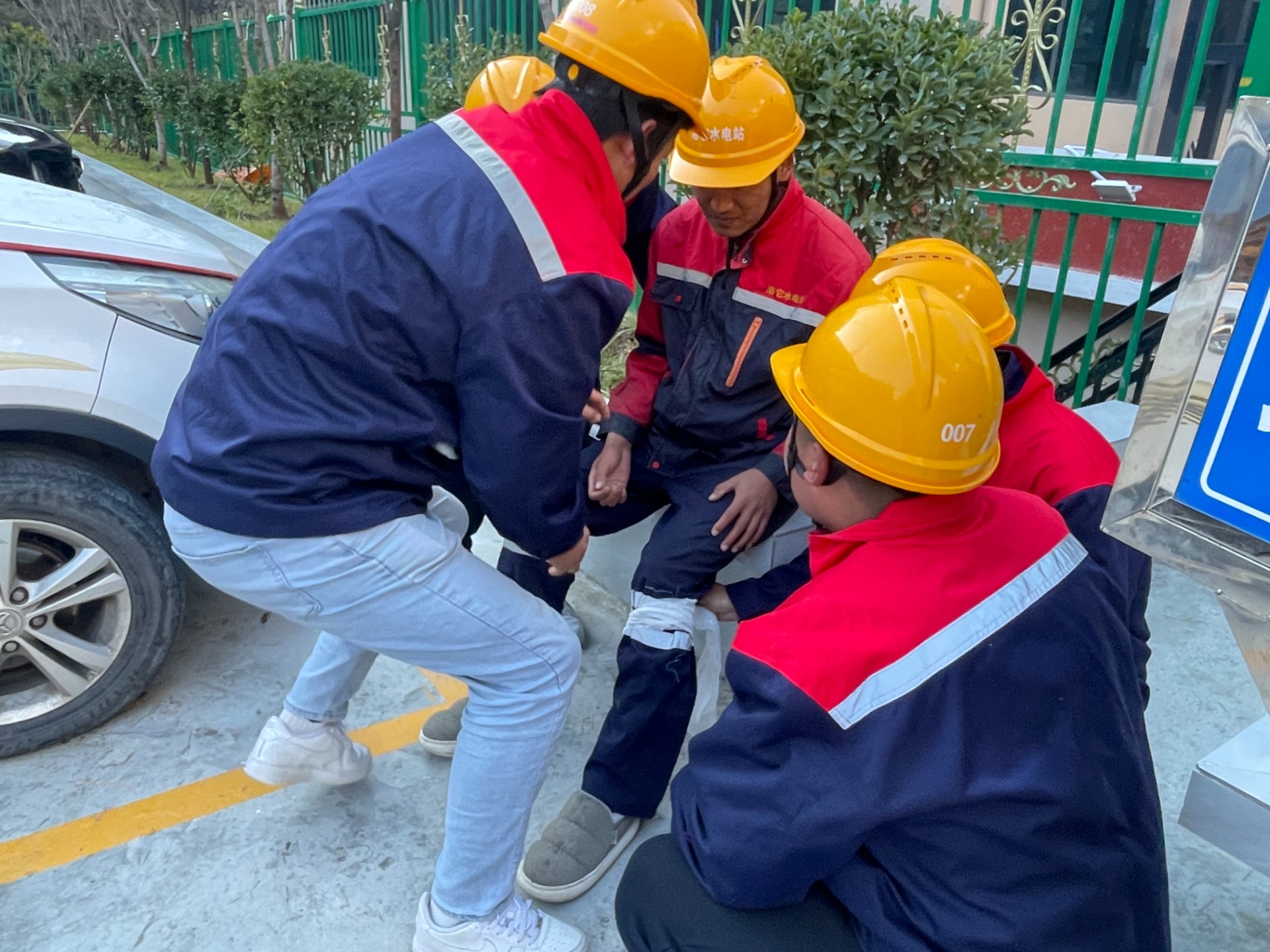 解说员:同组值班人员尼**听到呼救声后立即赶到伤员旁边,详细观察了解周围暂无物体坍塌后,通过对讲机将事故现场情况报告给应急救援总指挥部。