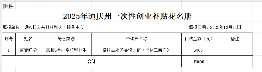 根据《迪庆藏族自治州人民政府关于进一步促进高校毕业生等青年群体就业创业的通知》(迪政发〔2025〕12号)规定。此次有康吉旺学1名创业者提交了2025年迪庆州一次性创业补贴申请,经审核符合申领条件。现拟为该名创业者拨付一次性创业补贴共计伍仟元整(5000元),同时将审核结果的有关情况(详见附件)进行公示5个工作日征询社会监督,公示期从2025年10月24日至2025年10月30日(法定节假日除外)。