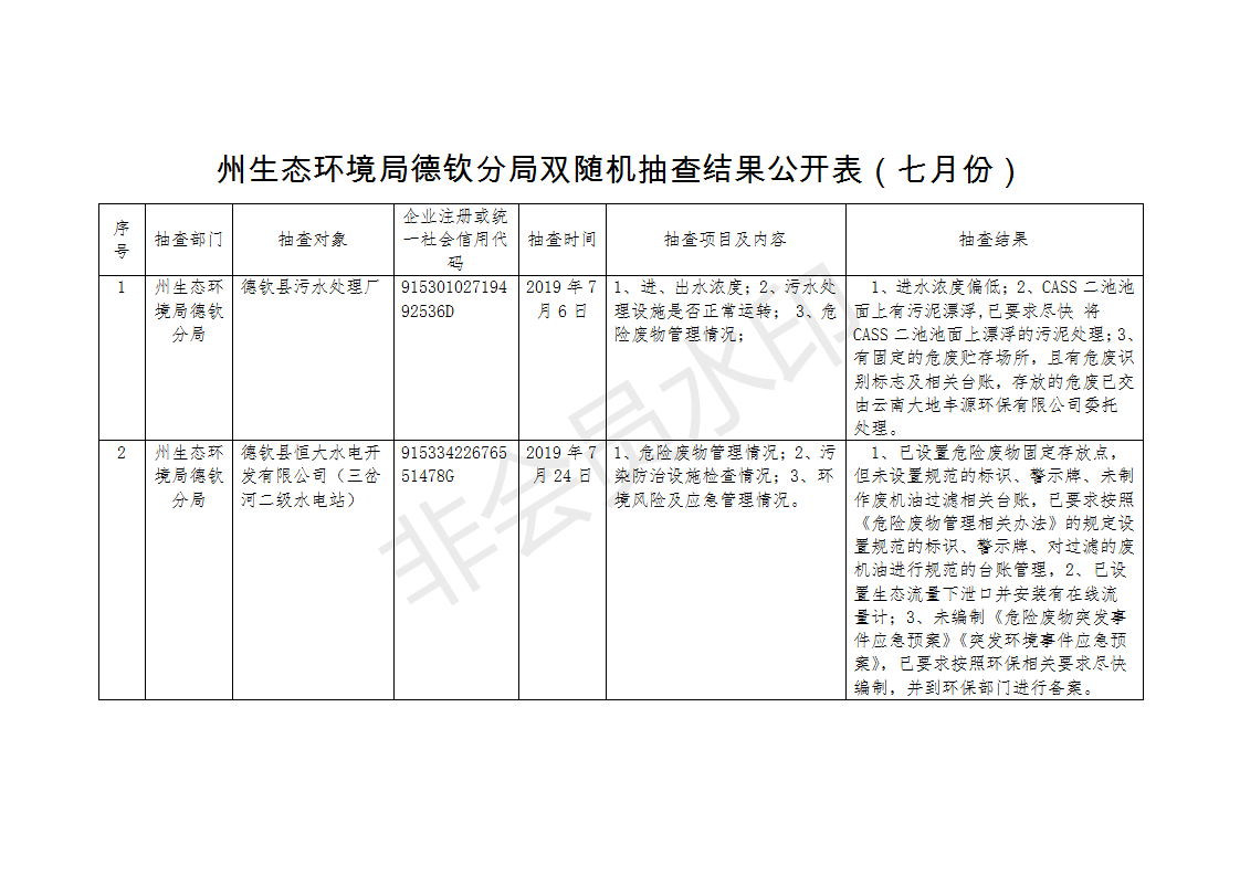 【生态环境】州生态环境局德钦分局双随机抽查结果公开表(七月份)