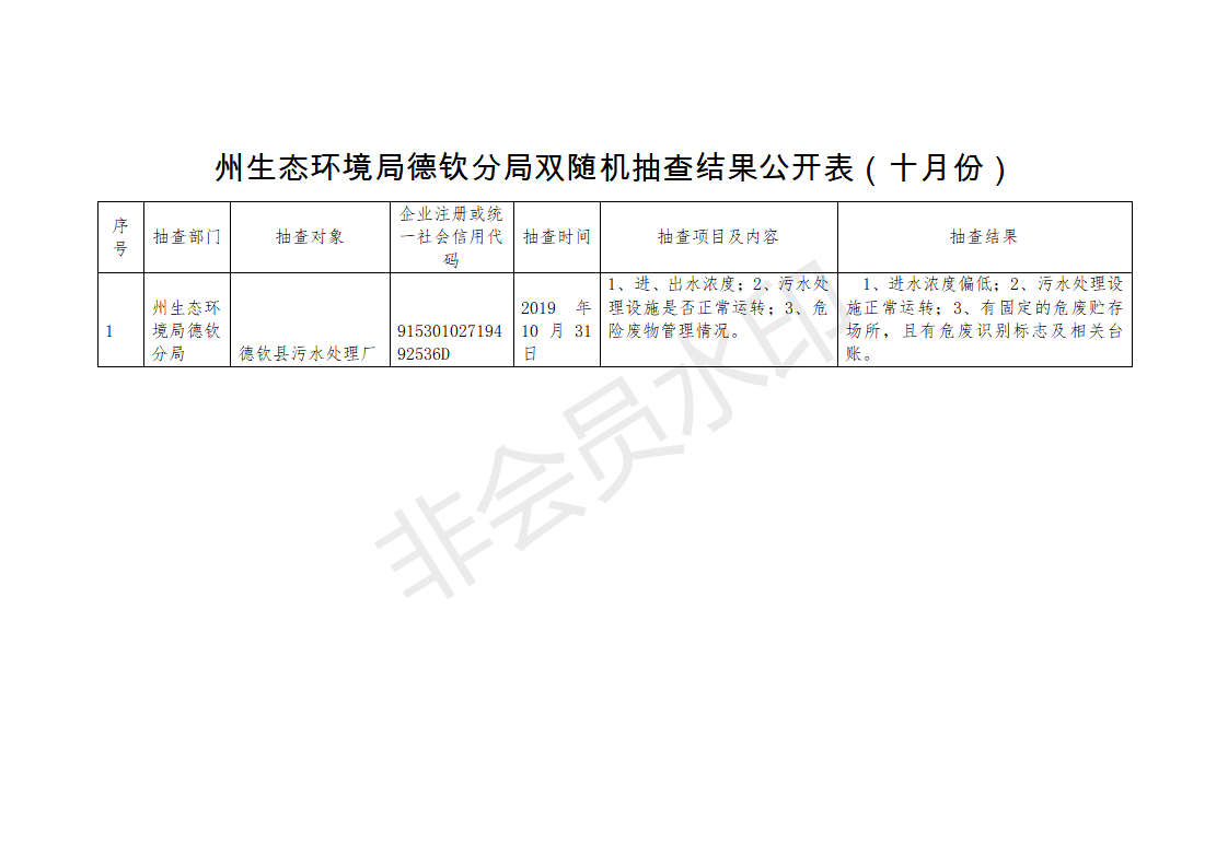 【生态环境】州生态环境局德钦分局双随机抽查结果公开表(十月份)