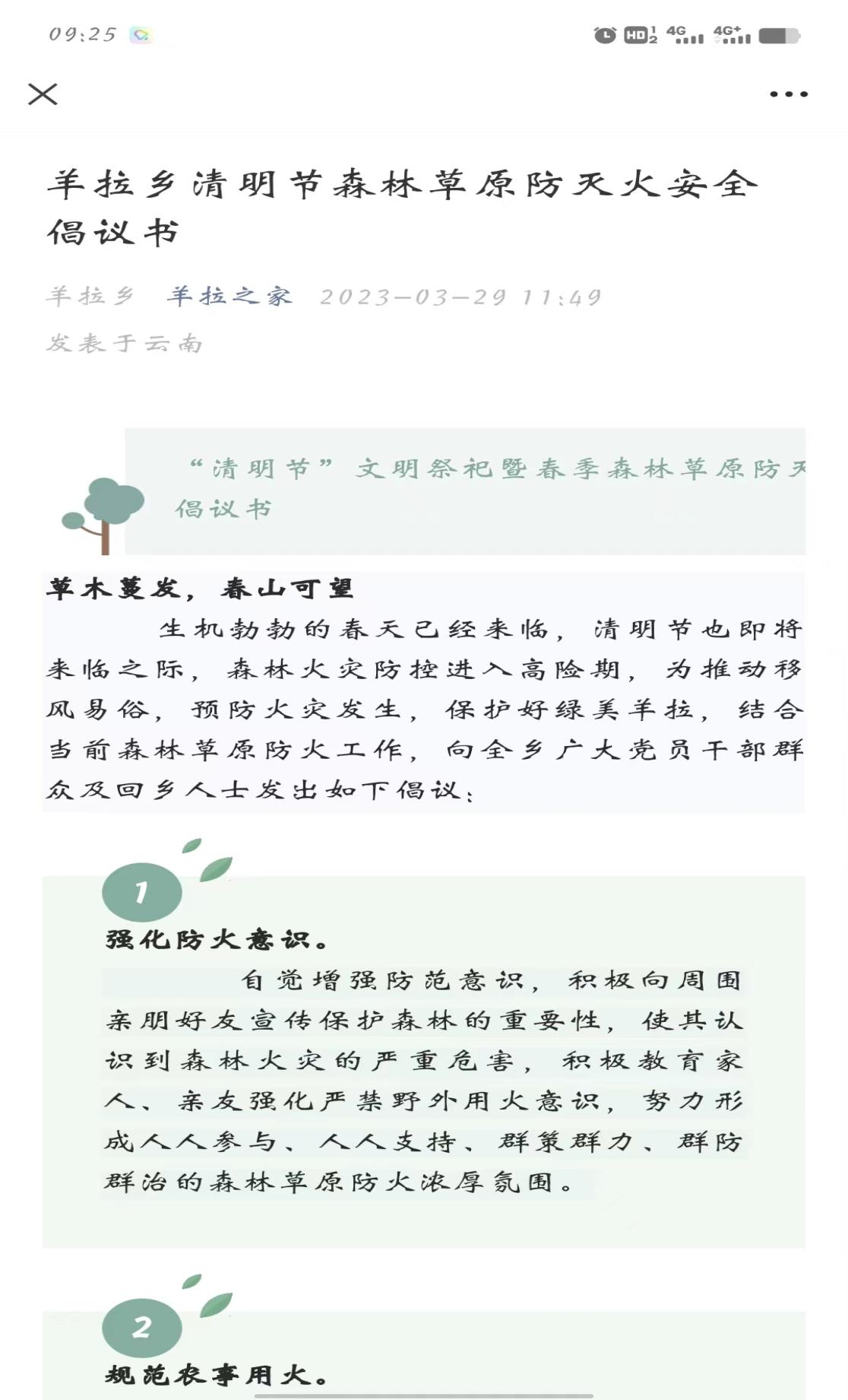 普法手段多样。在改进普法创新手段上羊拉乡积极努力转变并改进,此次普法宣传借助“线上+下线”的模式,在线上羊拉之家公众号中发布羊拉乡清明节森林草原防灭火安全倡议书,就强化防火意识、规范农事用火、传承文明祭祀、倡导文明出行、履行防火义务、尽到监护责任、沉着应对,科学处置、共同监管,从严打击等方面做好宣传,在4个村(社区)联络员群中进行积极转发;线下开展每个村(社区)动态巡查,通过拉横幅、贴标语、小喇叭广播的形式,向辖区群众普及法律知识。