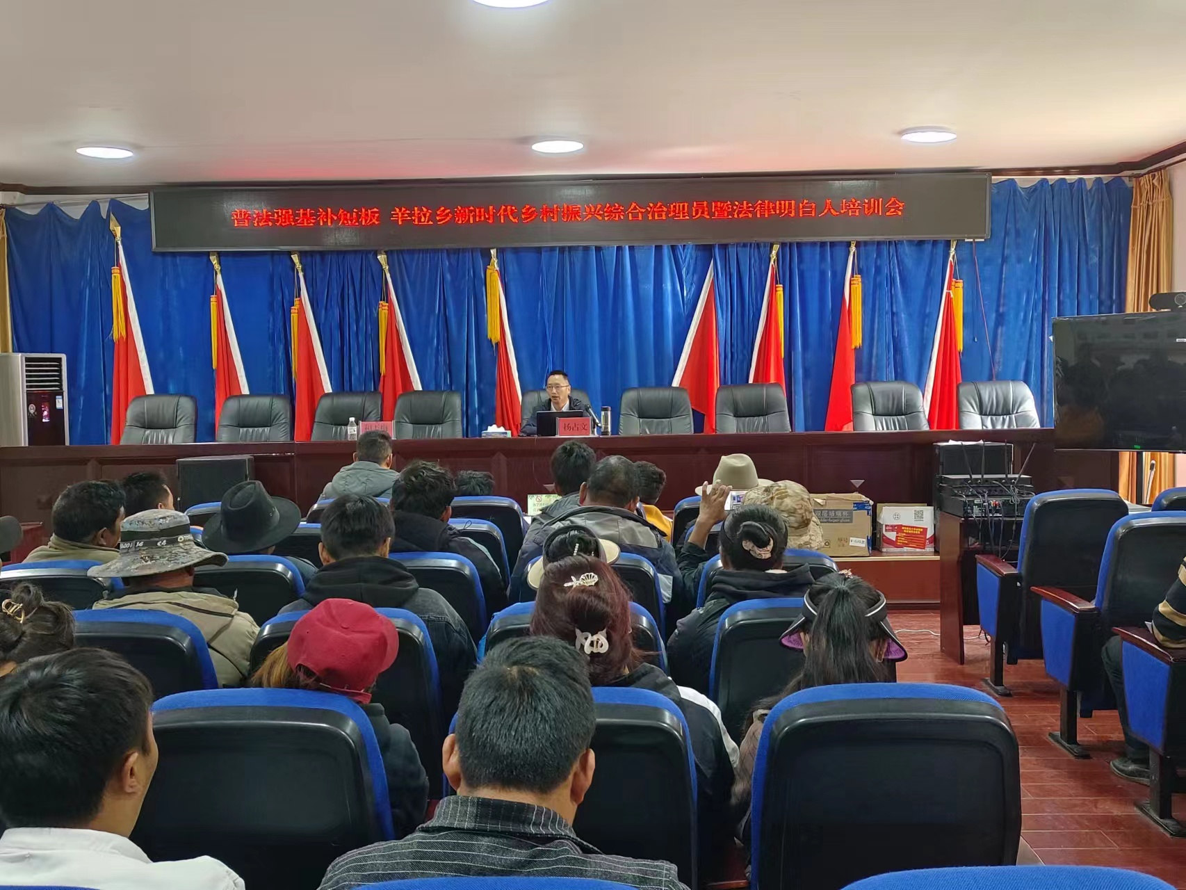 4月19日,德钦县普法强基补短板第二轮下沉羊拉乡甲功村开展第二场普法宣传教育,普法宣讲会由县政法委副书记主持,州法律援助中心律师参与讲解,甲功村干部、驻村工作队员、基层人民调解员、法律明白人、护林员、新时代乡村振兴综合治理员、农村用法示范户等重点群体参加普法宣传,普法宣讲会分三项议程。