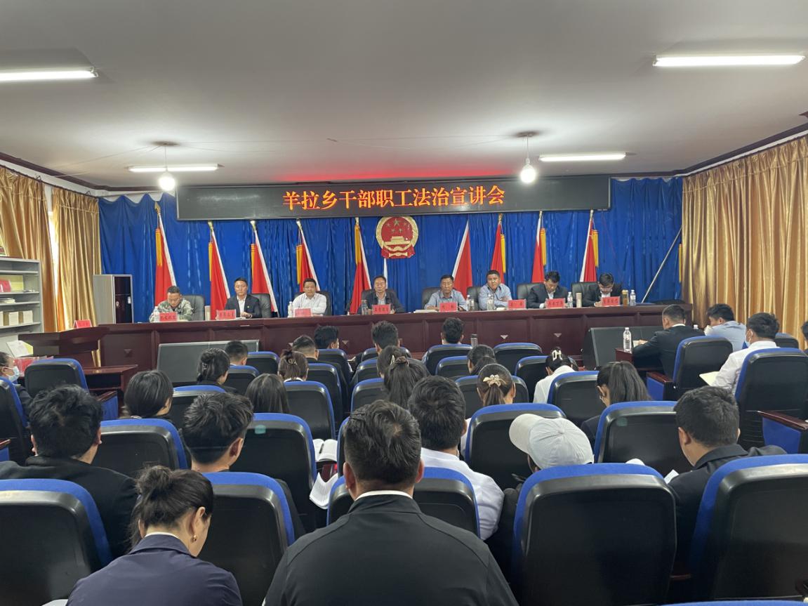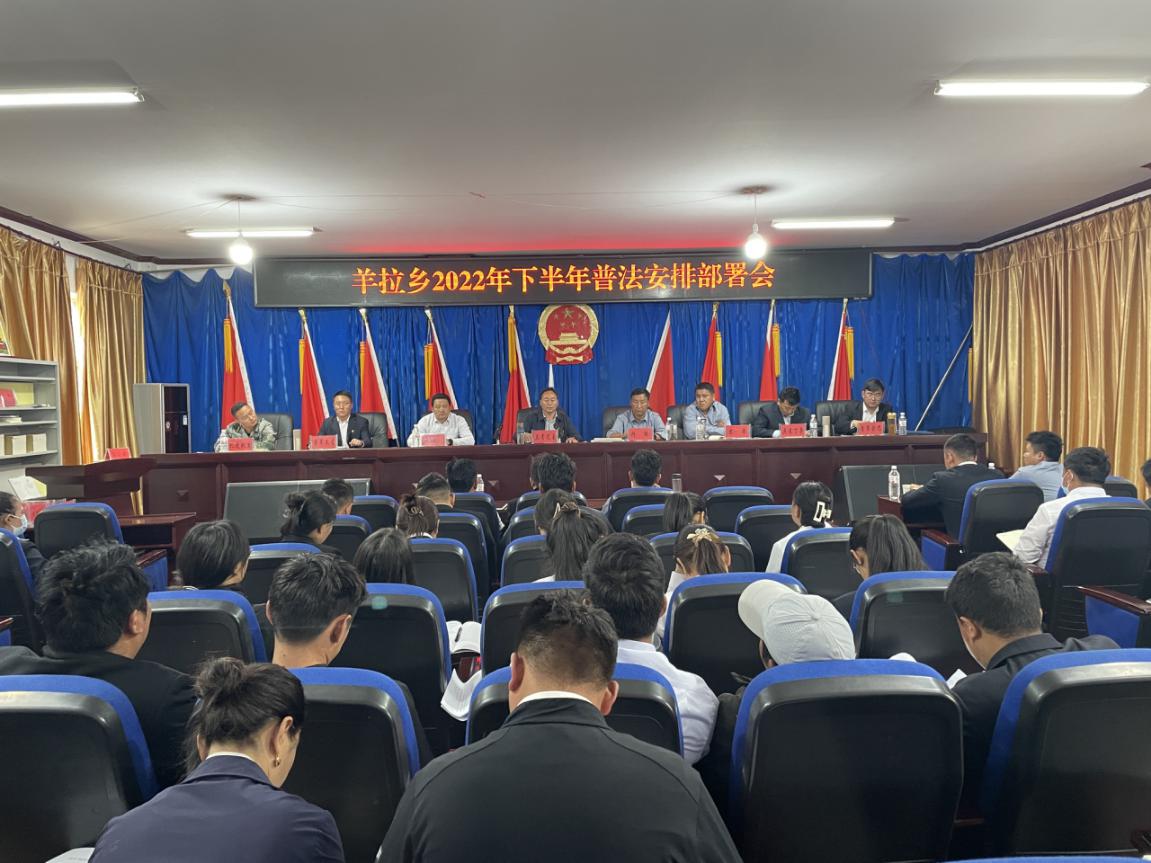 尊法学法守法用法氛围,近期羊拉乡召开2022年度下半年普法工作安排部署会议。全乡干部职工、村两委、司法所、派出所、卫生院等相关部门负责人共60余人参加了会议,会议由羊拉乡党委书记立青定主主持。