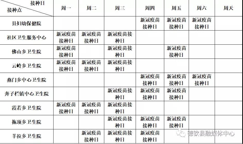 为方便全县广大干部群众接种新冠疫苗,满足接种需求,有序、稳步推进疫苗接种工作,现将各乡镇18岁以上人群接种新冠疫苗日排期公布如下: