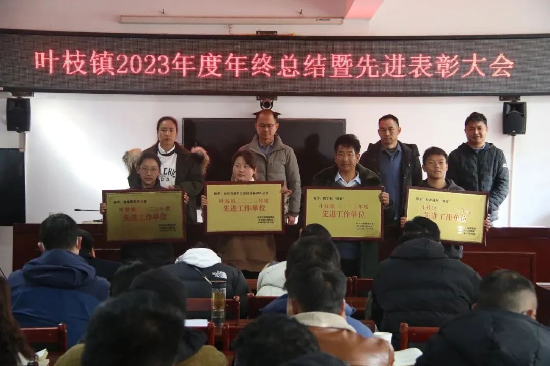 会议还表彰了在2023年度各项工作中表现突出、做出贡献的4个先进集体和9名先进个人,营造了浓厚的比学赶超氛围,让广大叶枝镇干部职工学有标杆、敢有方向、做有榜样。