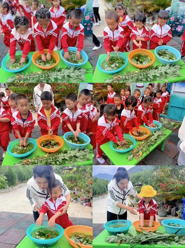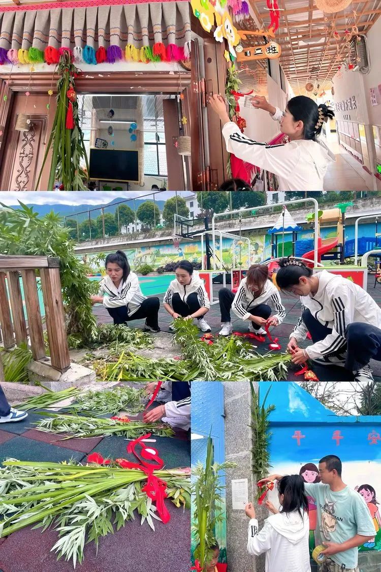 “挂艾草”--老师和小朋友们一起在门头悬挂艾草及菖蒲叶,寓意驱虫避毒保安康。
