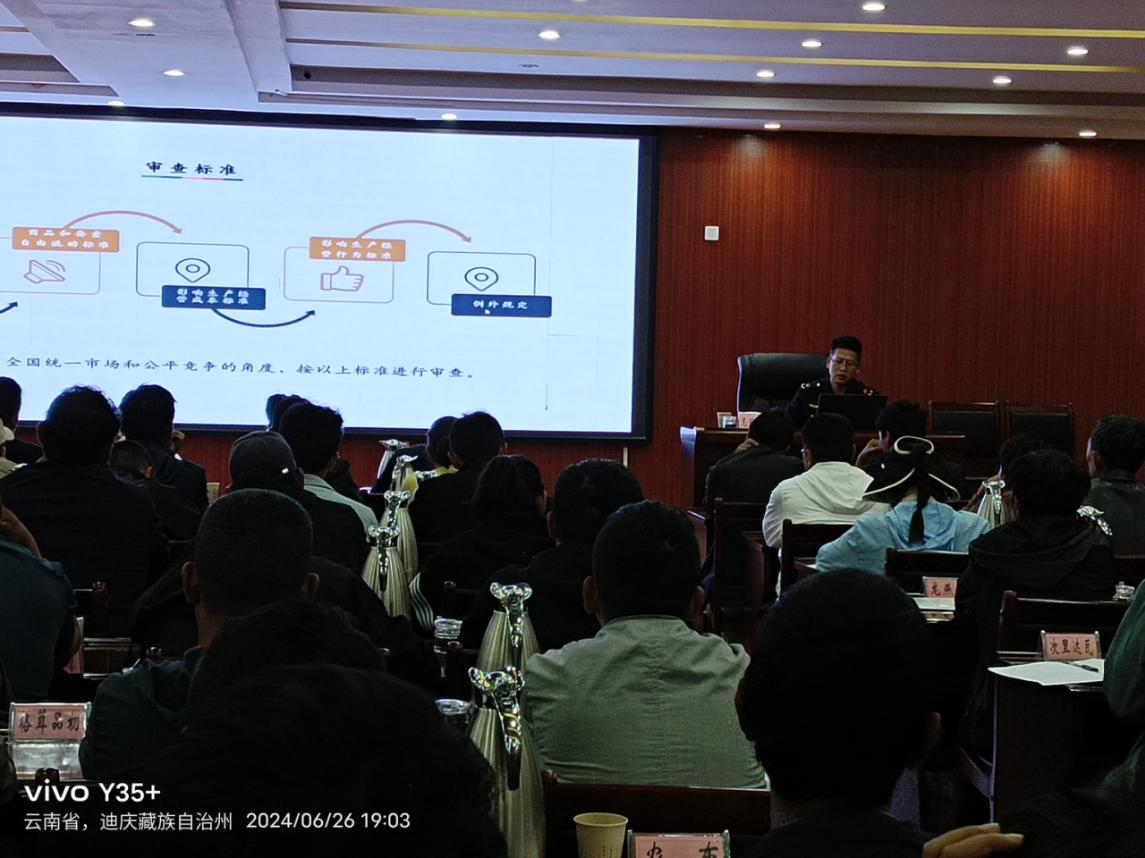 为深入贯彻党的二十大精神,立足新发展阶段,完整、准确、全面贯彻新发展理念,主动服务和融入新发展格局,推动高质量发展,着力构建覆盖事前事中事后全环节公平竞争政策实施机制,着力破除妨碍全国统一市场和公平竞争的体制机制障碍,着力强化公平竞争政策基础地位、促进形成公平竞争的市场环境,2024年6月26日,德钦县公平竞争委员会办公室主任、县市监局副局长以专题讲座的形式给德钦县委党校中青年干部培训班全体学员授课。