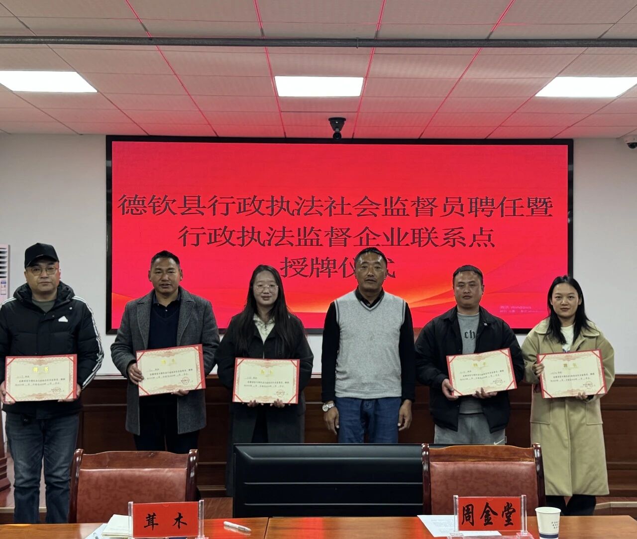 为进一步健全多层次、立体化行政执法监督体系,拓宽社会监督渠道,精准回应企业诉求,持续优化法治化营商环境,2025年12月1日,德钦县政执法社会监督员聘任暨行政执法监督企业联系点授牌仪式在司法局举行。县司法局主要负责同志,单位分管领导,新聘任的5名行政执法社会监督员及5家行政执法监督企业联系点代表参加仪式。