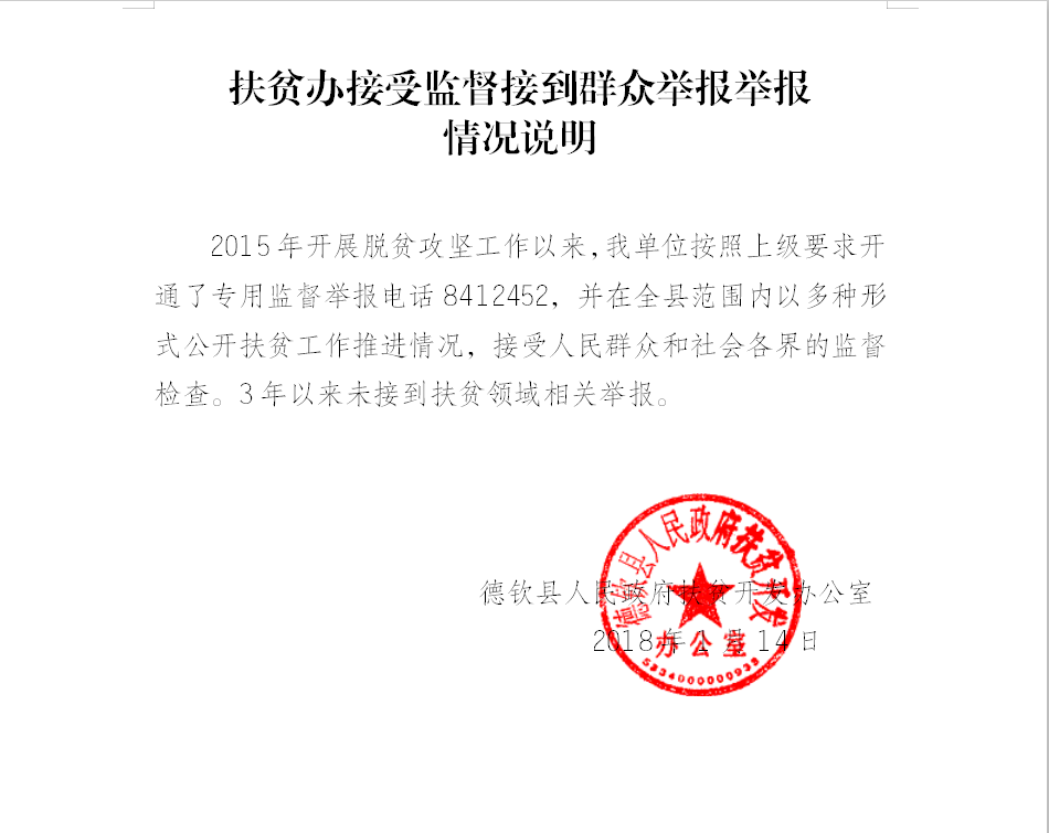 【重点领域信息公开】扶贫办接受监督接到群众举报举报 情况说明
