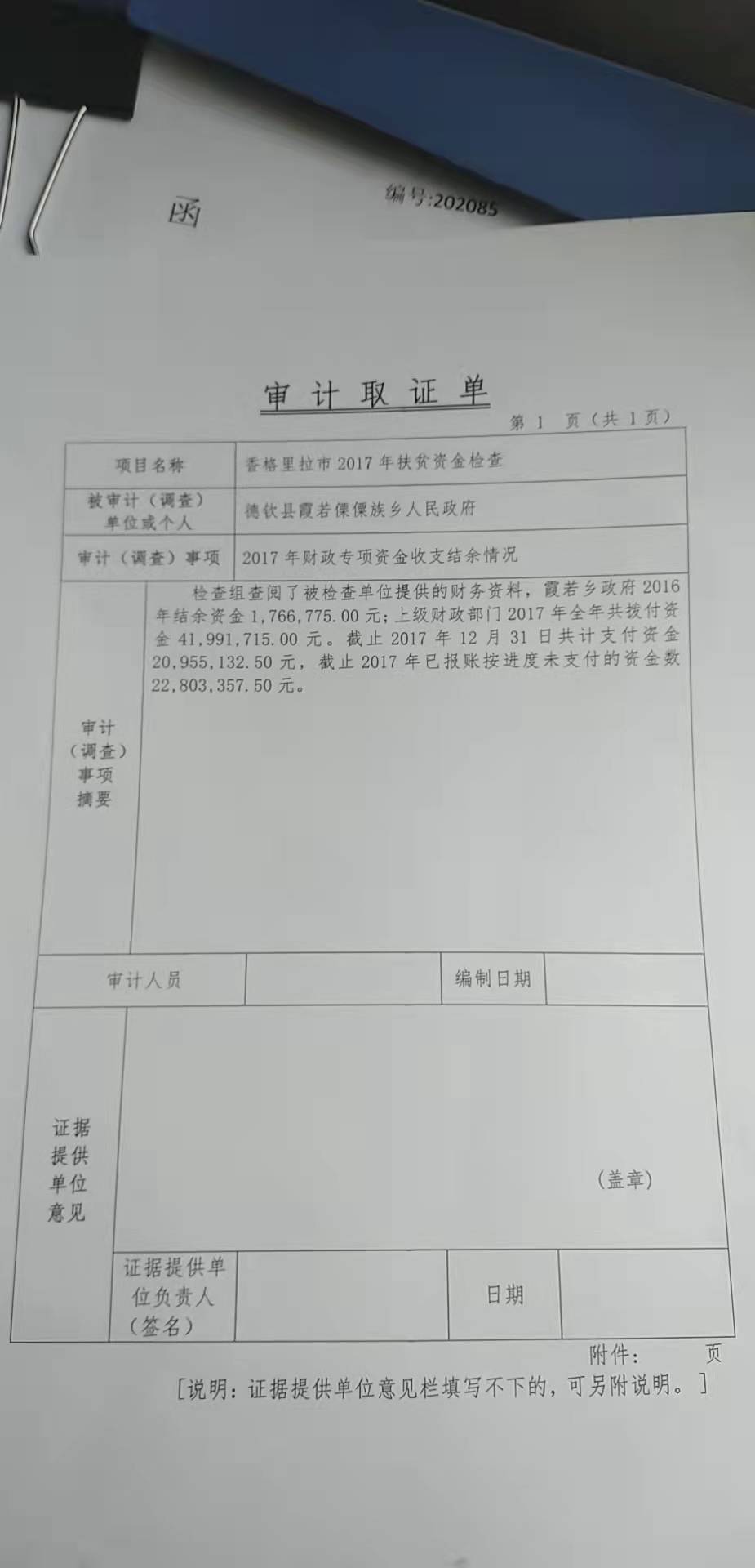 霞若乡扶贫资金检查 审计取证单