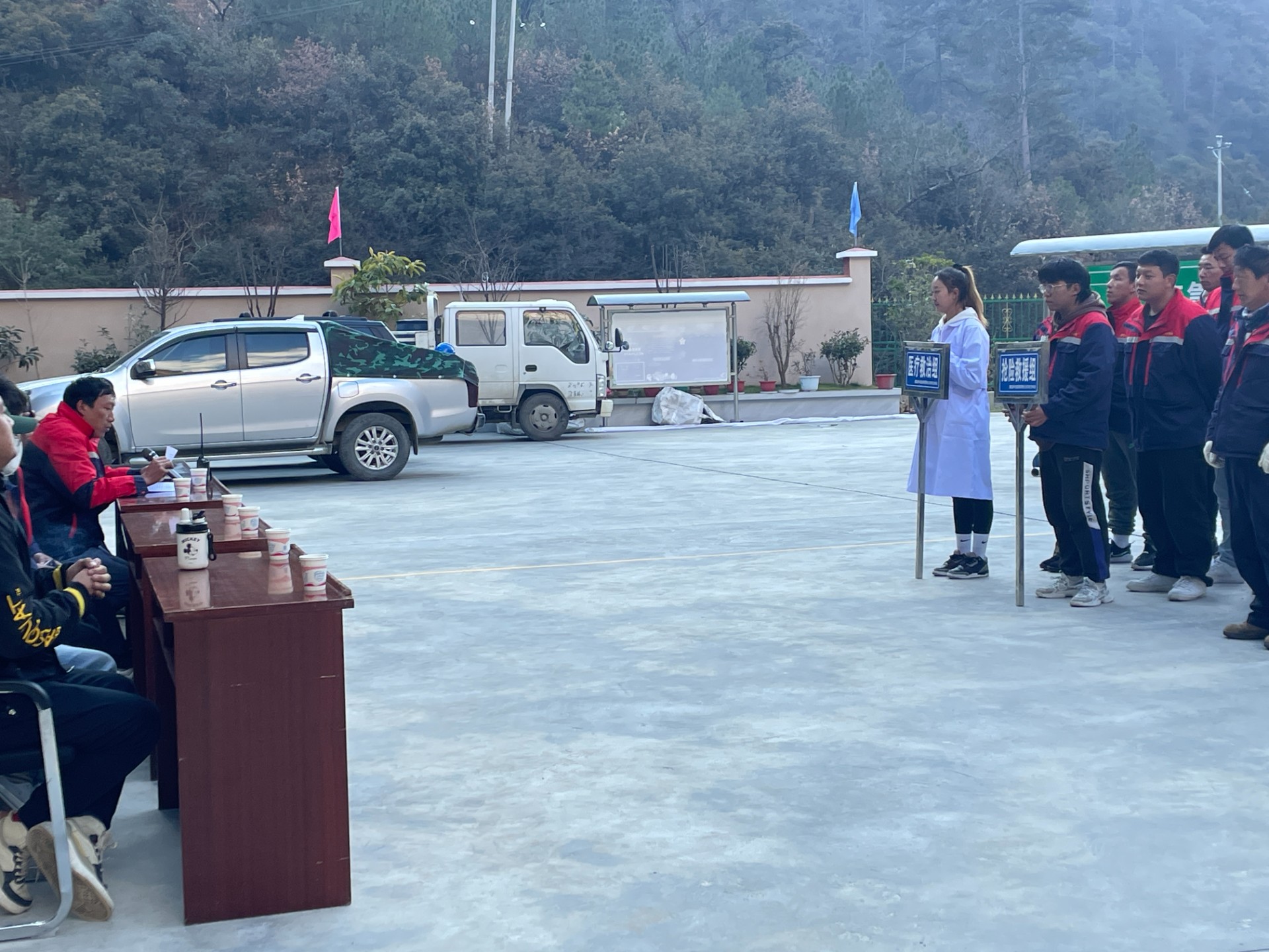 1、物资准备:急救箱(内放消毒药水、医用止血绷带、棉签等急救药品)、担架一床、对讲机四个