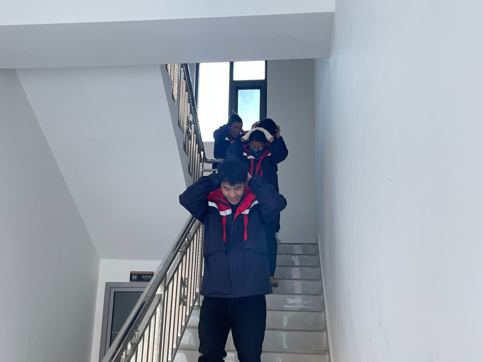 (1)应急避震:地震鸣笛信号响起后,疏散演练指导员立即指挥员工迅速抱头、闭眼,躲在桌子下,尽量蜷曲身体,降低身体重心,保护好头部,听口令进入紧急疏散演练环节。