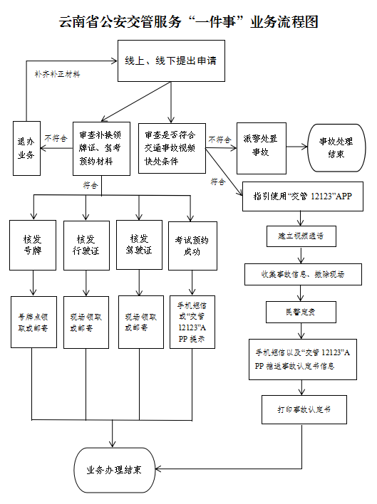 在云南政务服务网“高效办成一件事”专区设立公安交管服务“一件事”线上受理端口,通过“一键链接”方式跳转至互联网交通安全综合服务管理平台(PC端)或下载登录“交管12123”APP(手机端),实现在线办理。加强电子材料、电子证照等应用,确保线上办理自动调用有关材料,线下办理仅需提供身份证明。