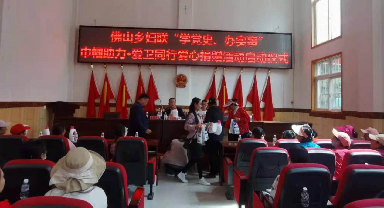 5月23日,佛山乡妇联举行“学党史、办实事”巾帼助力,爱卫同行爱心捐赠仪式。捐赠方美科技有限公司代表和受赠乡、村两级妇联执委参加了活动。