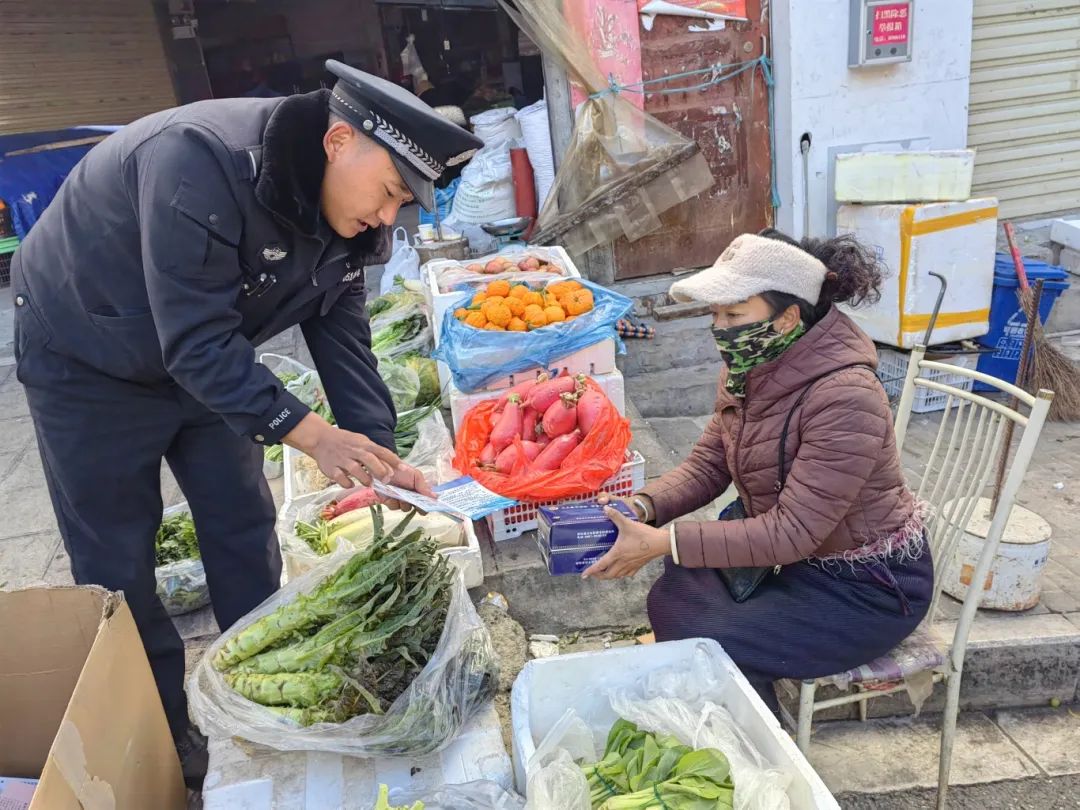 春节渐近,年货市场购销两旺。为保障群众舌尖上的安全,维护良好市场秩序,德钦县公安局奔子栏派出所积极行动,深入辖区年货市场开展食药环领域安全专项检查,全力为人民群众打造安全放心的购物环境。