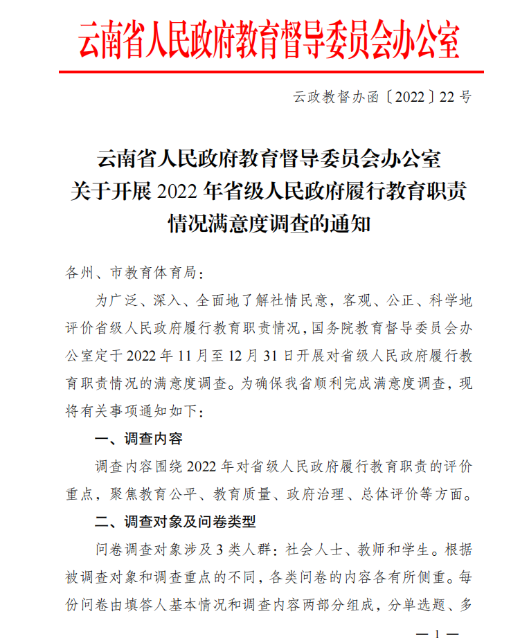 云南省人民政府教育督导委员会办公室关于开展2022年省级人民政府履行教育职责情况满意度调查的通知