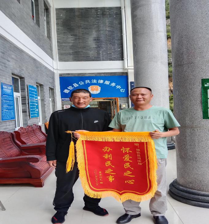 2022年8月1日,法律援助受援人鲁茸某某手持一面印有“怀爱民之心,办利民之事”的锦旗送到德钦县司法局党组书记、局长叶文彬手中,以表谢意。
