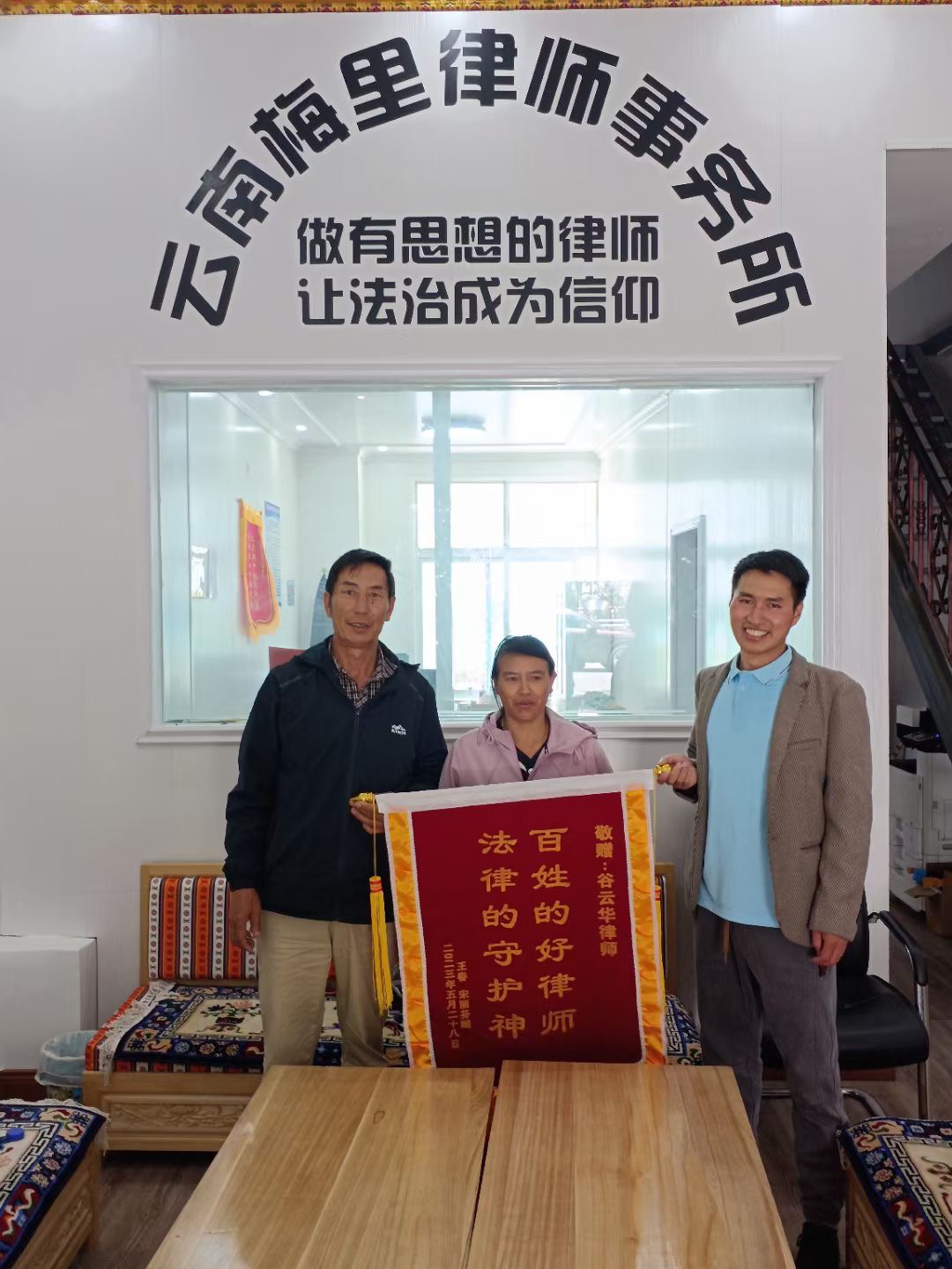 2023年6月5日,王某手持一面印有“法律的守护神,百姓的好律师”的锦旗送到了云南梅里律师事务所,以表谢意。