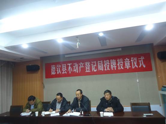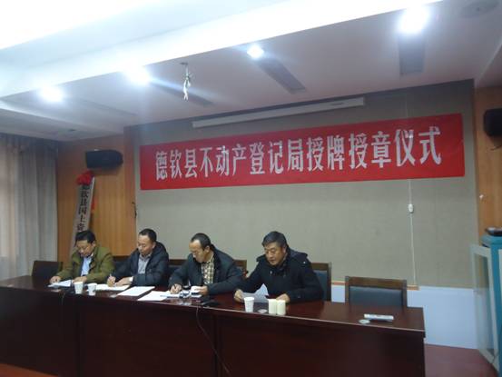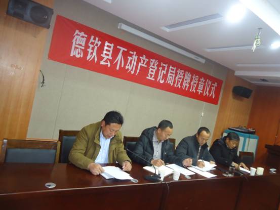 德钦县举行不动产登记局授牌授章 成立仪式 12月18日上午,德钦县不动产登记局授牌授章仪式在县行政大楼三楼视频会议室举行,标志着德钦县不动产登记局正式成立、不动产统一登记工作将全面启动。德钦县副县长宫布、县编办、县住建局、县林业局、县农业局、县地税局、县纪委、县政务局等县直单位的领导及县国土资源局在家全体职工共同参加了授牌授章仪式,仪式由德钦县国土资源局局长李小康主持。 仪式上首先由德钦县国土资源局党组书记泽仁达瓦汇报了德钦县不动产登记局筹建工作开展及组建进程相关情况。接着,县委编办主任立青都吉宣读了关于德钦县不动产登记局的成立文件。随后,德钦县宫布副县长代表县人民政府作讲话,他指出:“成立不动产登记局是中央全面深化改革的重要组成部分,是国务院机构改革和职能转变的重要内容,是一项重大的民生工程,涉及老百姓的切身利益,工作面广、量大、技术含量高,因此希望不动产登记局要加强宣传,大力宣传开展不动产统一登记工作的重要性,增强群众基础,争取社会舆论和公众的支持配合;要以坚持维护广大人民群众合法财产权益、保障交易安全、便民利民为原则和宗旨,从源头上考虑合理设计工作流程、尽量减少环节、简化办事程序、节省登记费用,确保政府行政效率和服务水平得到提高和完善”。 最后,由德钦县国土资源局李小康局长向新成立的不动产登记局工作人员授牌授章,李小康局长发言表示“将以这次授牌授章仪式为契机,充分发挥职能,以严实精神、严实作风,履职尽责、依法行政、开拓创新,真正形成具有坚强战斗力和凝聚力的集体,更好地服务全县人民”。