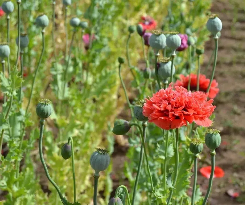 识别要点:花朵艳丽(红/粉/白/紫),叶片有锯齿,果实球形(罂粟壳),是鸦片、海洛因原料。