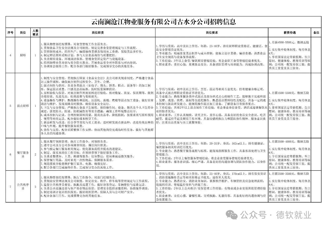 云南澜沧江物业服务有限公司古水分公司招聘公告