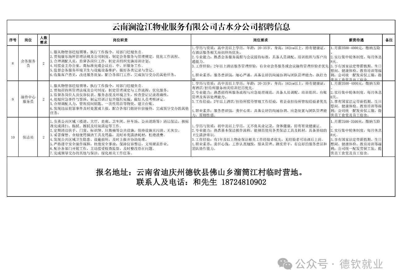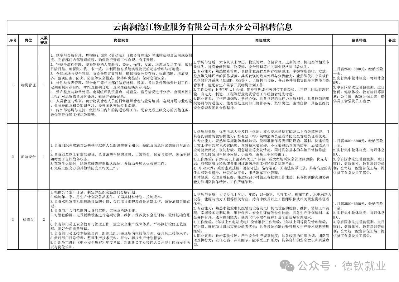 云南澜沧江物业服务有限公司古水分公司招聘公告